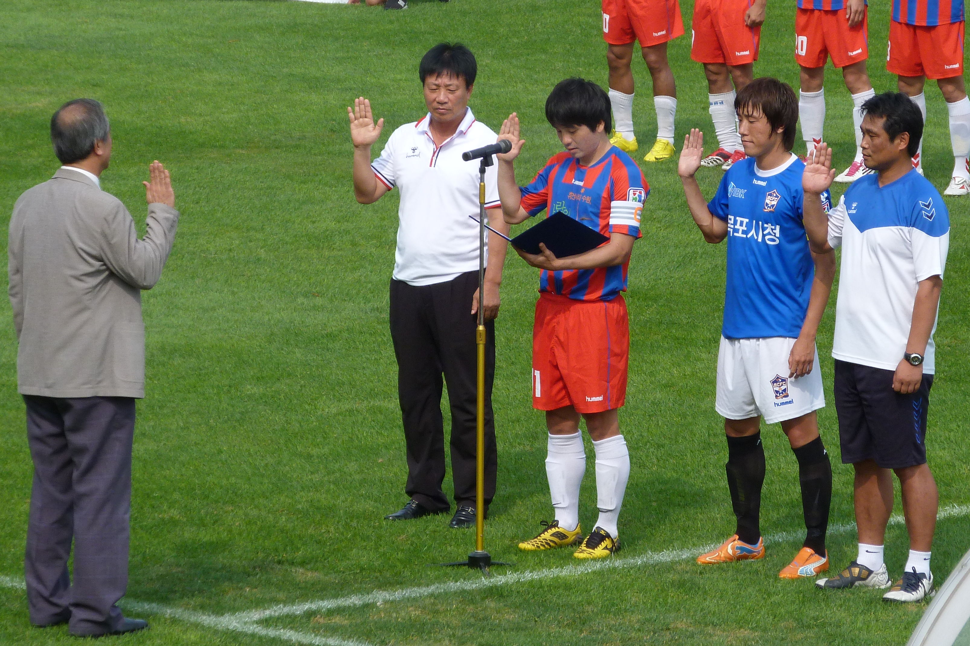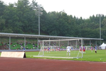 Suwon were in red and blue stripes with red shorts whilst Mokpo wore blue shirts and white shorts. The Mokpo players looked a lot taller overall than their Suwon counterparts. Away keeper Cho Sang Won must have been at least 6’4“ and he had a couple of ugly looking centre halves of a similar height in front of him. I doubted that Suwon would have much joy at set pieces.