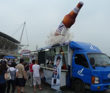 With an hour to go to kick-off we caught a taxi up to the World Cup Stadium. It takes around fifteen minutes from Jeonju centre. After sorting the tickets for behind the goal we got some free beer at the Hite van. Again, I’ve got used to stuff like that but it’s not something Tom encounters too often in the UK.