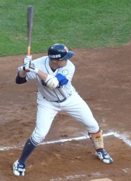 Lee Sang Yeol  was the starting pitcher for LG and he conceded again in the fourth when Kim Dong Joo hit a home run to make it two-one to the notional visitors. I’d normally post a photo of both starting pitchers, but unfortunately I’ve mistakenly deleted all my pictures from this game so you’ll just have to imagine what Mr. Lee looks like. Doosan were wearing their black away strip as they were the away team, but here’s one I’d taken at a previous game of home run scorer Kim Dong Joo.