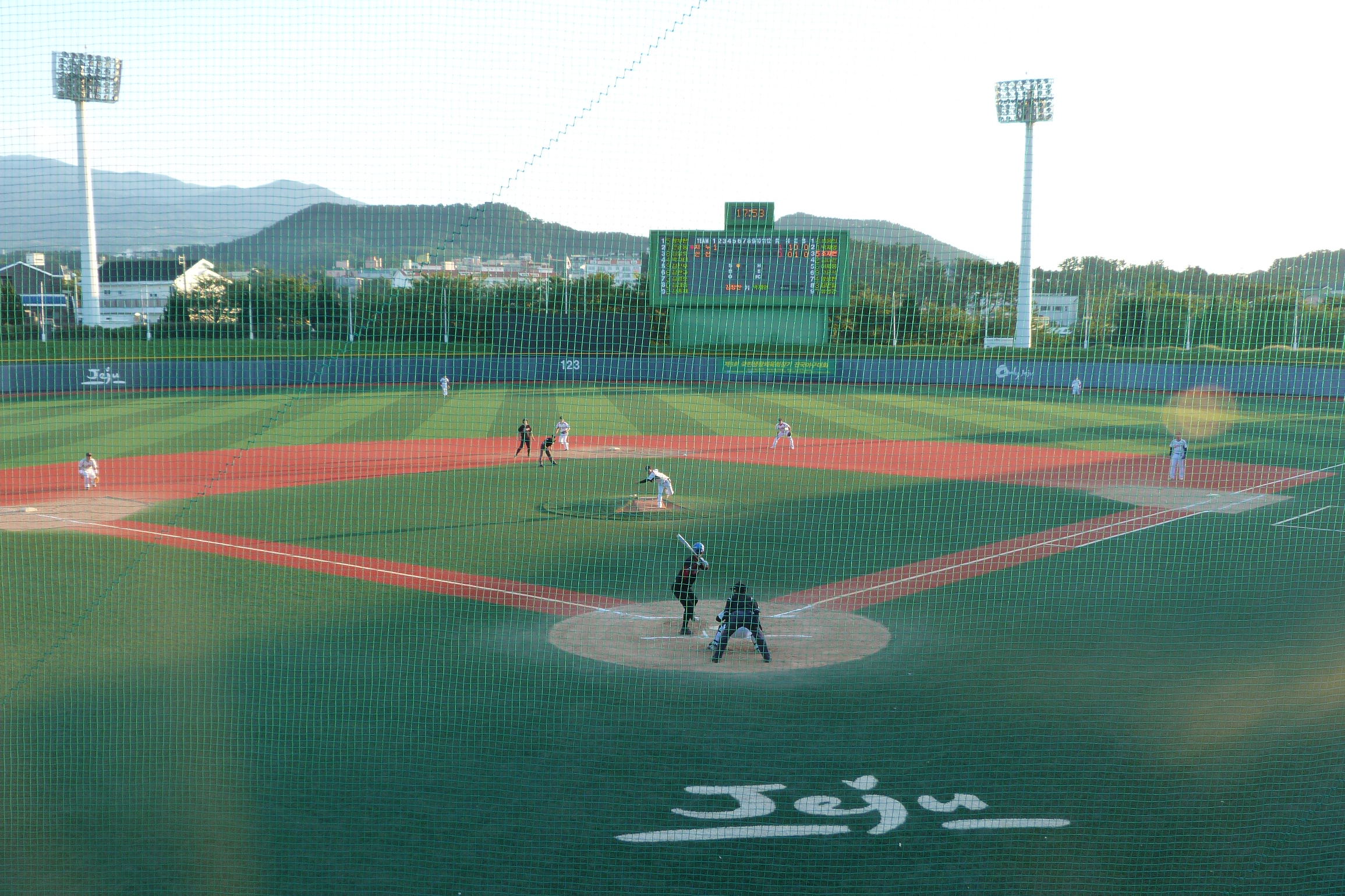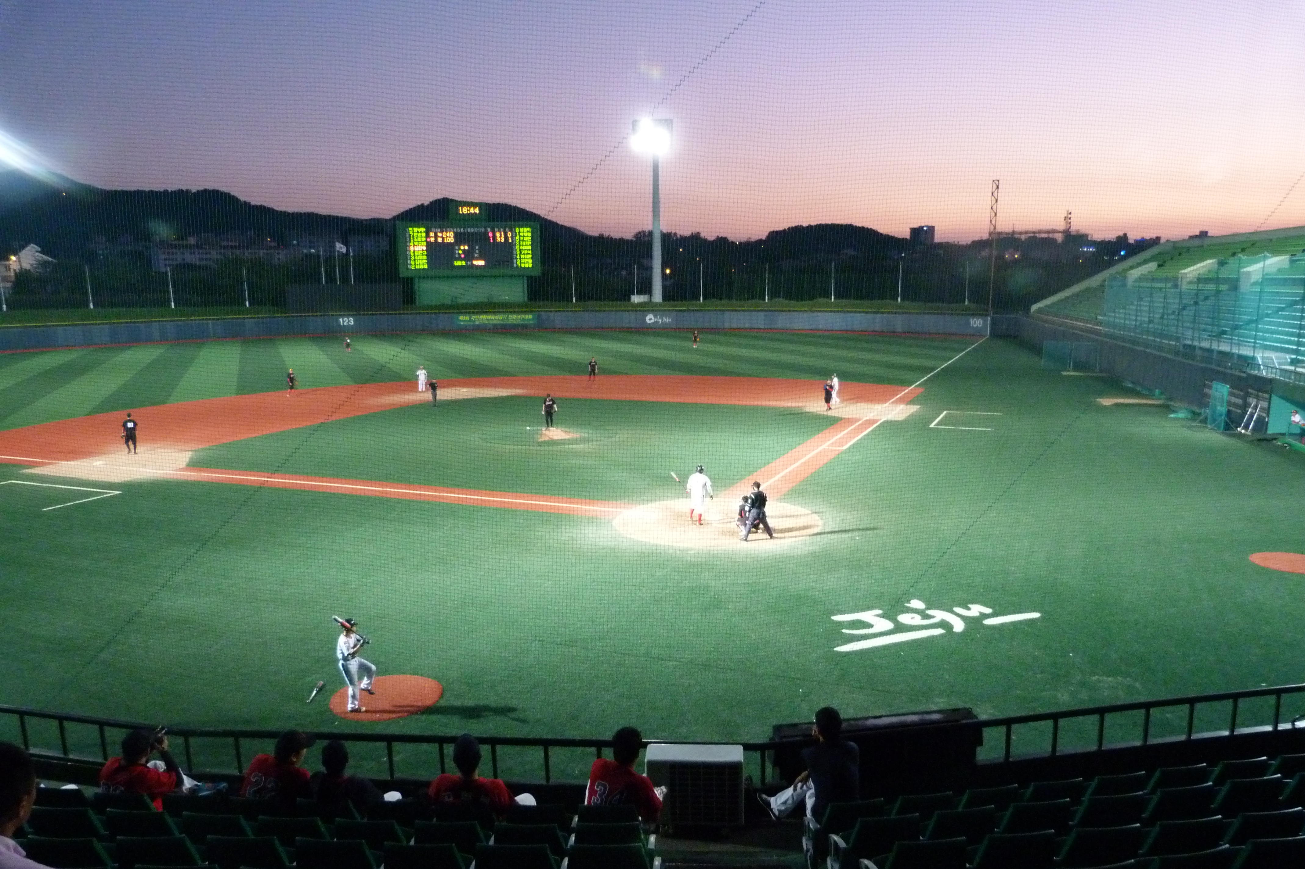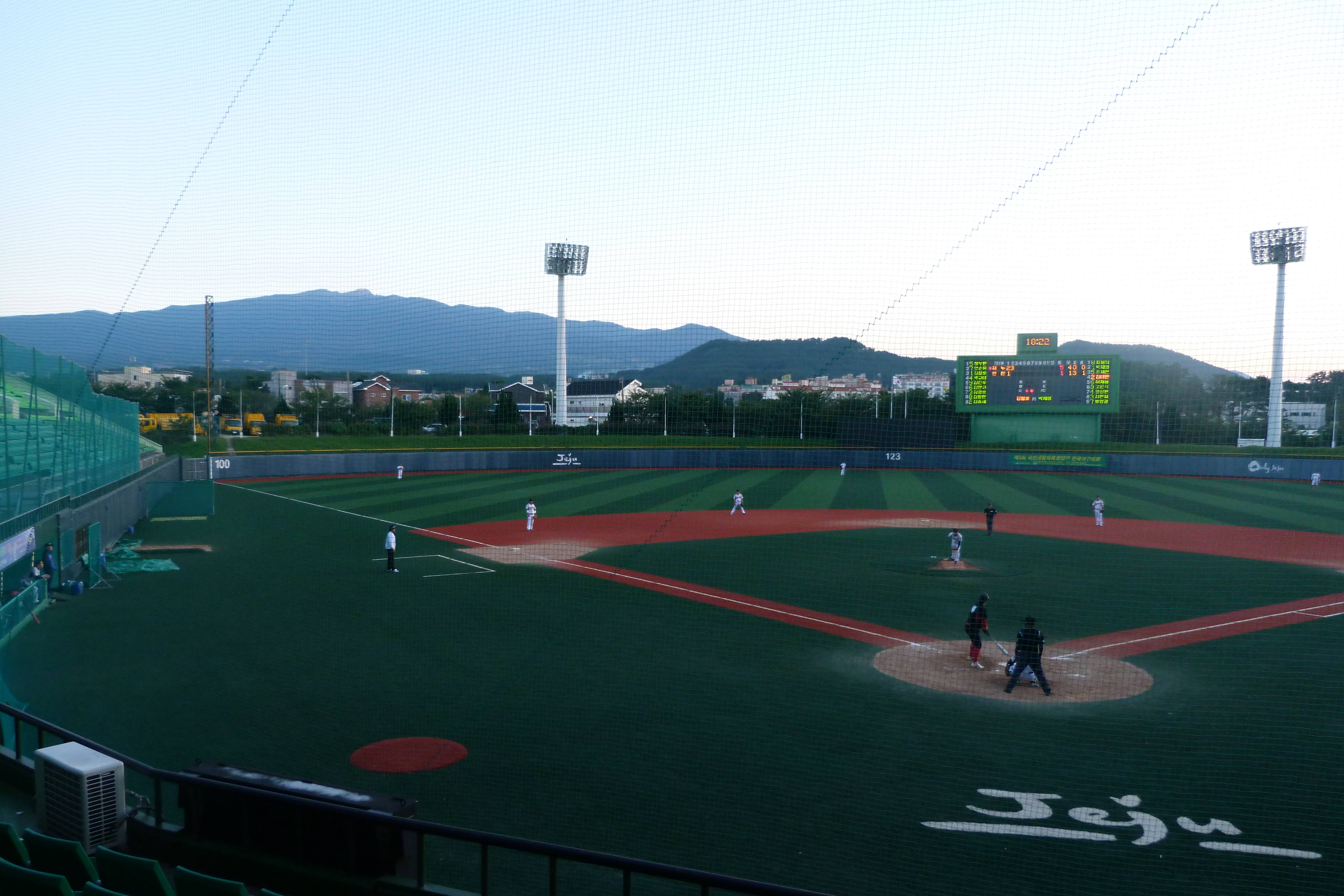 There was a game just finishing as we went in, but with another scheduled for six o’clock we got some food and drinks from a stall outside and then went back to sit in the posh seats and wait for the action. The light was starting to fade, but with a beer in hand and the 1950m Hallasan providing the backdrop, a virtually empty small-town baseball stadium is still a decent place to be.