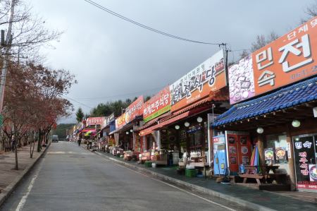 It took a while for us to get down to the cable car station. The rocks were slippery and after I had whacked my knee against a railing due to losing my footing I was more than happy to take the easy option of a ride down to the bottom. As part of my healthy eating regime we had some fried battered ginseng when we got there. It was ok, better than we expected and judging by the number of places selling it, pretty popular in Daedunsan. The area at the foot of the hill was just as busy as when we’d set off, this time with people selling acorns, chestnuts and mushrooms to the visitors who had built up appetites riding the cable car.