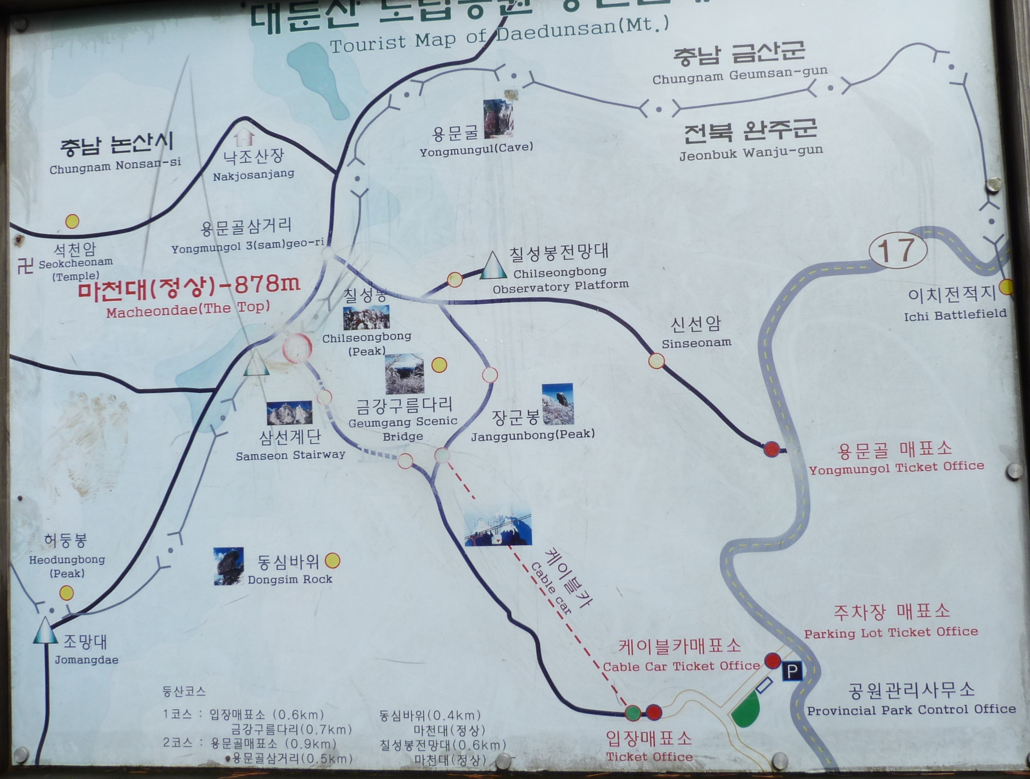 Despite our bus having been almost empty, the area around the shops was fairly busy. One of the attractions of Daedunsan is that it has a cable car that goes about three-quarters of the way to the top and so it’s a popular day out for people who don’t fancy hiking but are keen to combine quail and nightclubs with a trip up a hill. Despite my low ratio of muscles and bones to fat we didn’t bother with the cable car, at least not on the way up. I don’t mind saving my knees on the way down a hill but you don’t really get that sense of achievement if you’ve only done half the ascent by yourself. Besides, we’d just spent an hour on a bus, it was time for some fresh air.