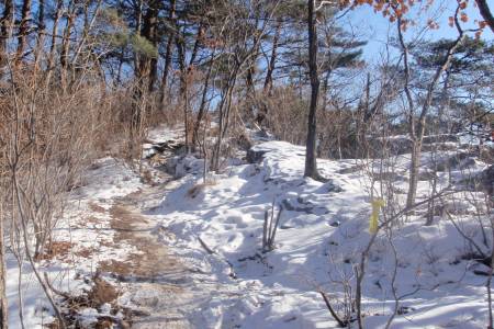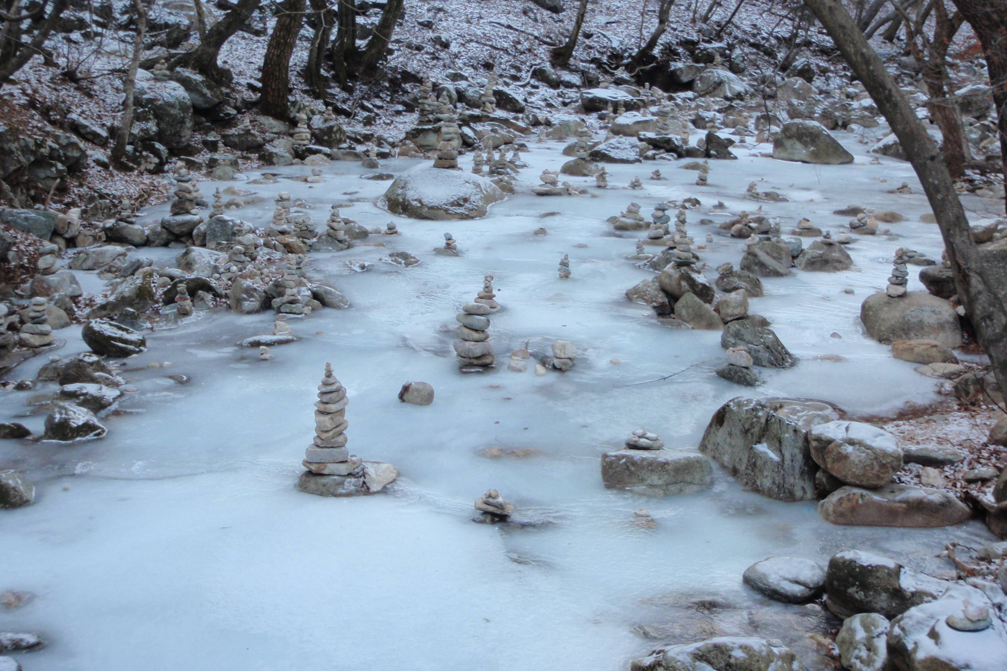 I followed a path that went between the tree and the temple. A hundred metres or so further on I had a choice of following a path towards Sangwonsa or going directly to the main Yongmunsan peak. I headed straight on and the trail went upwards quite sharply, following the frozen stream. There weren’t many people hiking, or at least there weren’t too many on this particular route, although I suspect that most people would have started walking a little earlier than I did.