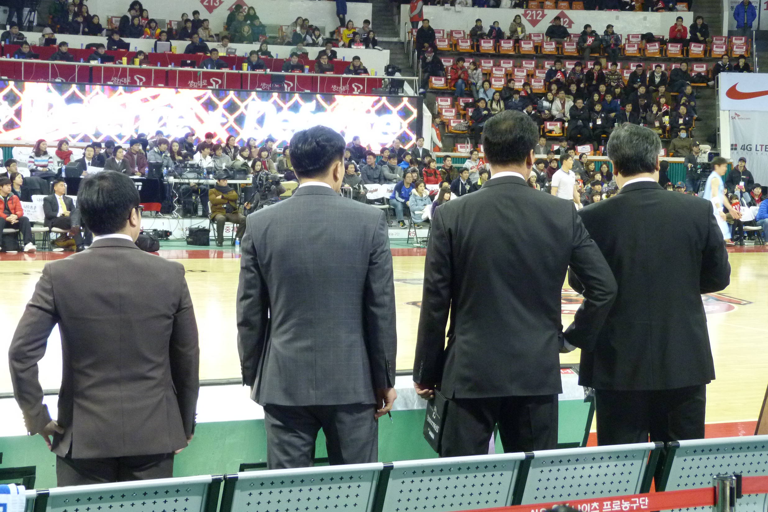 I bought some chestnuts and a bottle of water from a stall outside the arena. The water was, of course, frozen solid and remained that way until the game was over. I ignored the touts for a change and paid twenty thousand won at the ticket office to get a ‘floor’ seat three rows behind the players. That was a bad move as my view was obscured by coaching staff and towel boys. I’d have had a better view from the back row.