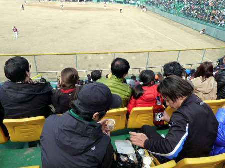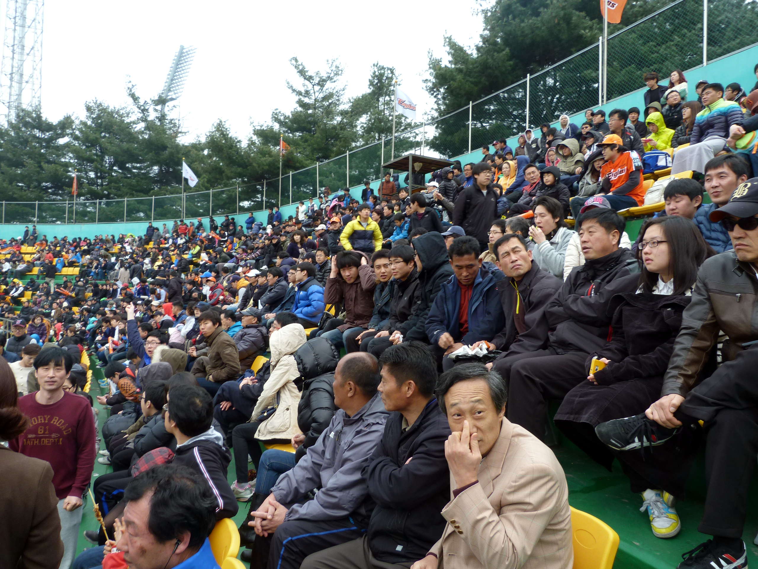 Cheongju Baseball Park has a capacity of twelve thousand. At the time the game started I’d estimate that it was around half full. People continued to turn up over the next couple of hours and I’d say the attendance peaked at around ten thousand. Of course, there were no seats to be had later on as latecomers had to compete with the handbags and boxes of chicken that were occupying the remaining places.