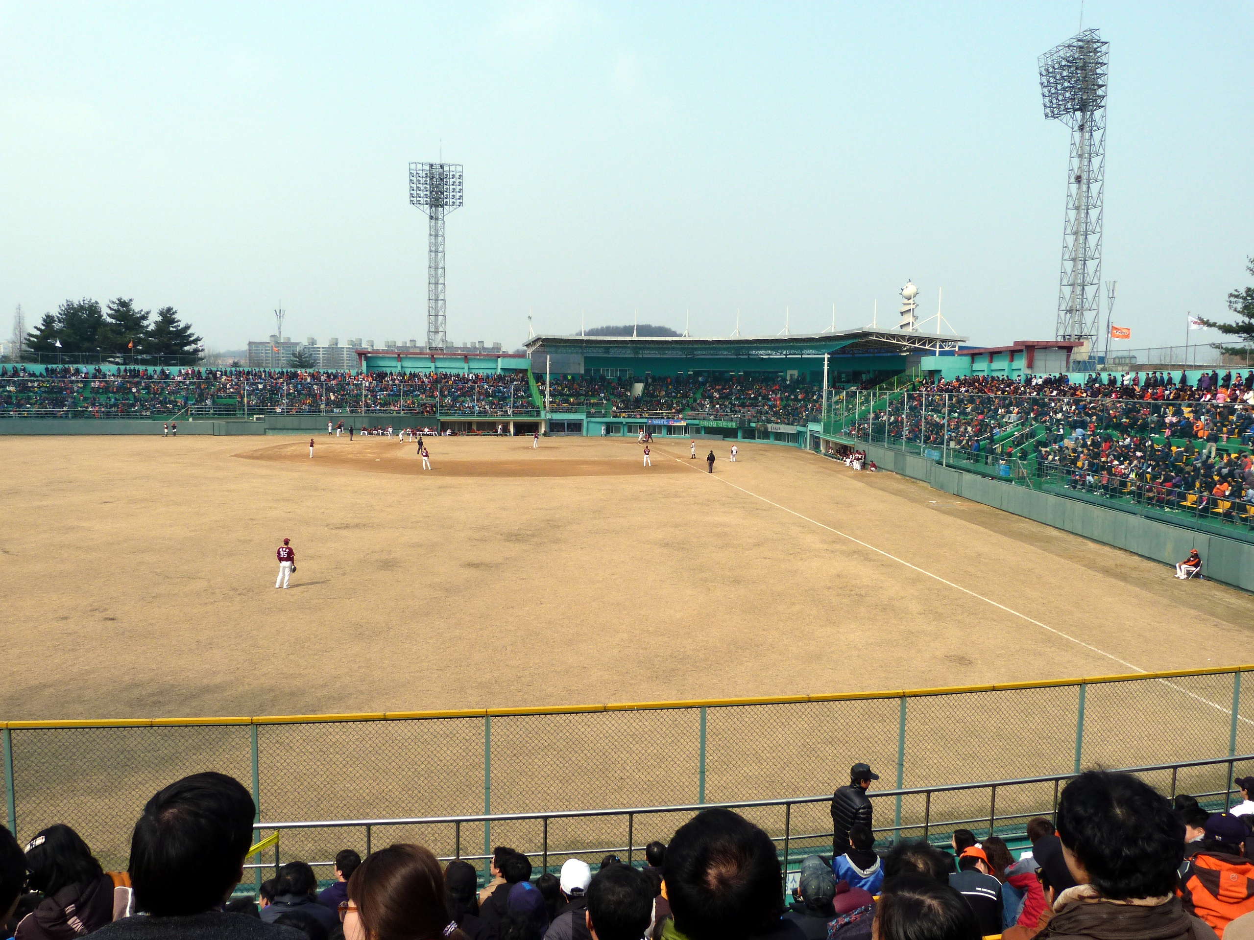 Jen had stuff to do and so I went to the baseball by myself. A taxi dropped me off outside Cheongju Baseball Stadium ten minutes before the start. I’m glad I didn’t have a car to park as the car park was full. In fact, all the roads leading in and out were packed with cars as well, parked three abreast and stopping anyone from leaving out of turn.