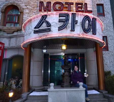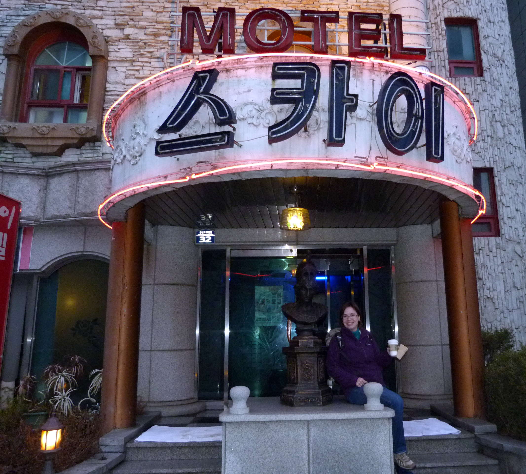 After watching the FA Cup first round tie between Cheongju Jikji and Ajou University the previous day, Jen and I had stayed over in Cheongju for a pre-season baseball game. There are plenty of motels in the area around the bus stations and we selected one on the basis of its towers, stone cladding and the fake bronze bust in its doorway.