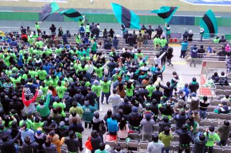It was a cold day and whilst Jen was fine with that during the walk, she was less confident of her ability to avoid hypothermia whilst sitting in a football stadium for two hours. She headed off back to Yeoksam (on the subway) and I got myself a fourteen thousand won ticket for the Jeonbuk end.