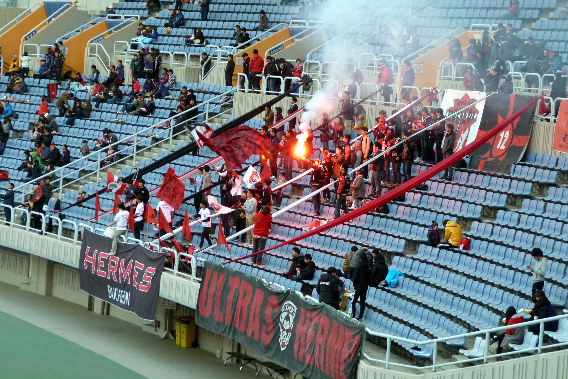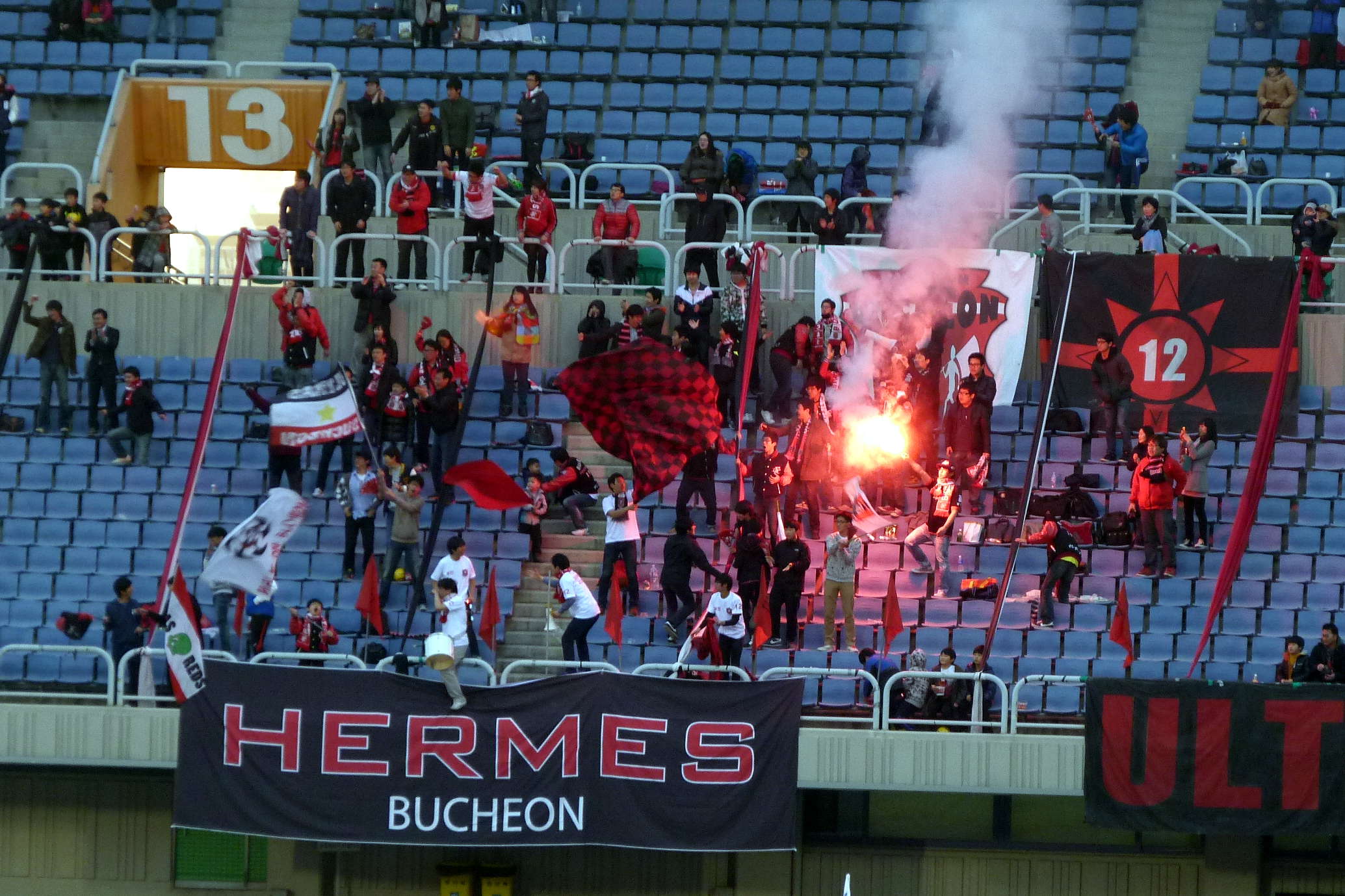 The Bucheon fans were very impressive, singing throughout the match and they marked the start of the second half with a flare. Bucheon 1995 is a club that was founded by supporters of SK Bucheon after the K-League club was relocated to Jeju Island a few years ago as part of the effort to de-centralise clubs from the Seoul area. Whilst the new team play in the third division, they use the same stadium that SK Bucheon did and they wear the same colours.