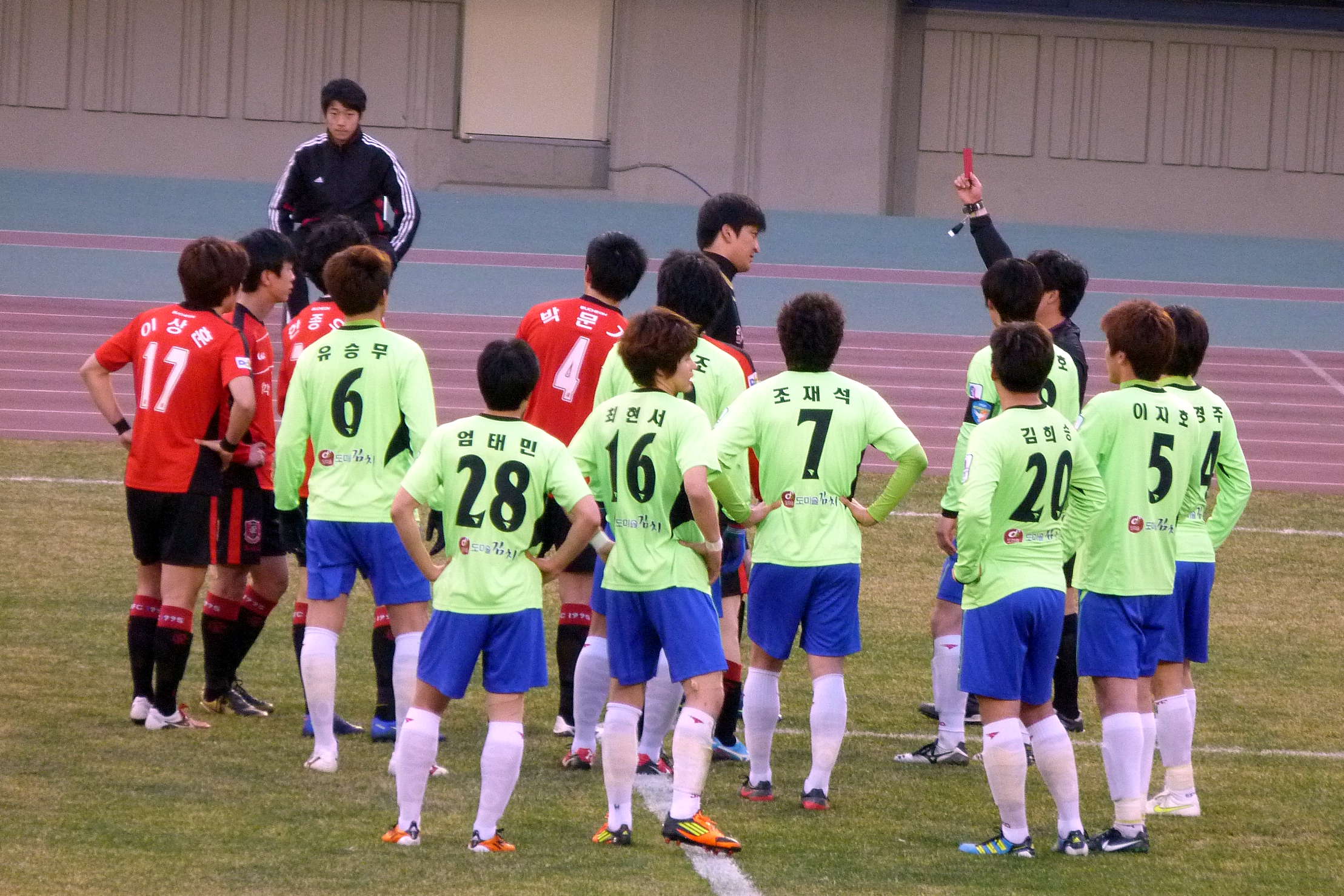 The game came to life ten minutes after the interval when the Paju goalie flattened a Bucheon striker on the edge of the box. It looked like it was going to end in tears from the moment he set off as he was never likely to get to the ball first. Even though the ref had little option but to send the keeper off, the lad was furious, throwing his gloves to the pitch in a fit of temper.