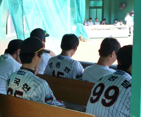 Sangdong was actually worse than Daegu’s Gyeongsan training base. At least the latter had seats that followed the shape of the pitch, albeit not too many. Sangdong had a sort of bus shelter high up behind the plate with four or five rows of seating. You could probably get about a hundred people or so into it. Initially I stood to one side and watched the game from there, before spotting an empty seat towards the back.