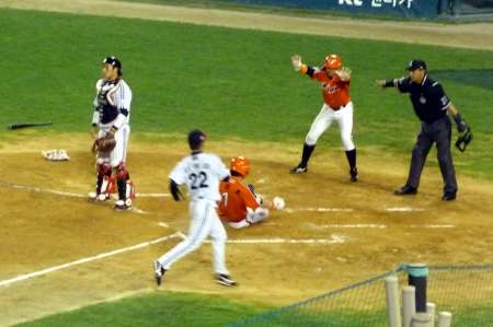 Kim Kyung Eon hit to second where the ball was fumbled. The mis-field was enough to allow the lad who had been on second, Jang Sung Ho, to get home along with the fella who had been on third.