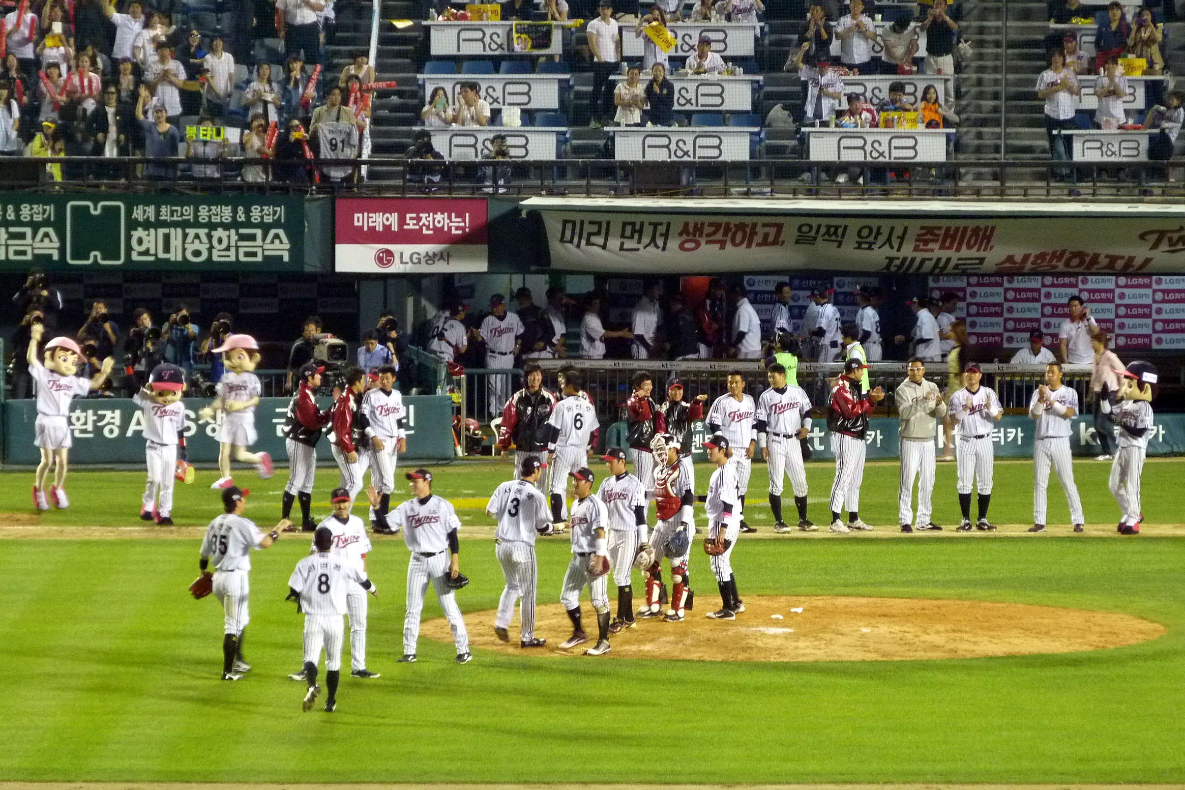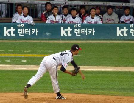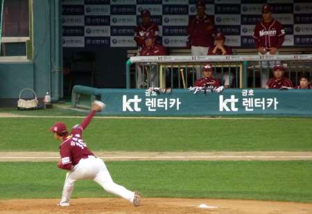 Anyway, back to Korea and the baseball. The mid-week series at Jamsil was between LG Twins and Nexen Heroes. Usually the visit of Nexen wouldn’t have been of much interest to anyone, they tend to spend most of their time near to the bottom of the table. This season though it’s different and Nexen are currently the form team. After recording 3-0 series victories over Samsung Lions and Lotte Giants last week, Nexen had extended their winning run to eight games by taking the first two games against LG Twins this week.
