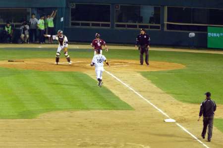 Nexen’s Yoo Han Joon got his usual stick from the Twins fans whenever he came to the plate. I still haven’t found out what makes him so unpopular at Jamsil, but whatever it is, the home supporters love having a pop at him. In the fifth he was able to give them a bit back by getting the hit that allowed a team-mate home for Nexen’s first run of the evening.