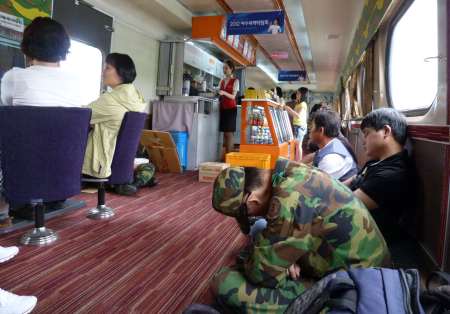 Jen and I caught the Saemaul train from Yongsan to Yesan. The Saemaul train is the next one down from the KTX and has quite a spacious buffet car. It’s as well that it does really, as we got to the station too late to collect our pre-booked tickets and had to just jump on to our train moments before it left. All of the seats were sold out so we resorted to finding a space on the floor of the buffet car alongside the grannies and soldiers.