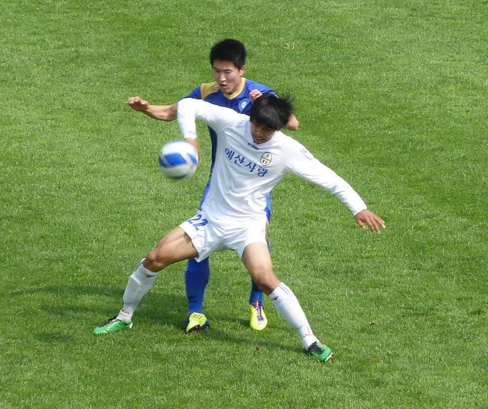 Yesan were in all white whilst Icheon were in blue. As I’d expected, most of the early pressure came from the visitors but it took them half an hour to open the scoring. A stray shot ended up at the feet of Kim Tae Kwon eight yards out and he finished comfortably. The lead didn’t last long though and five minutes later Kim Tae Hoon weaved his way through an Icheon defence that kept backing off to equalise.