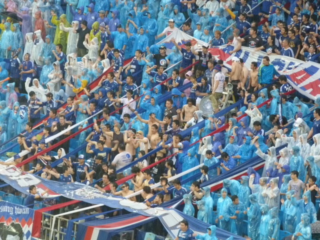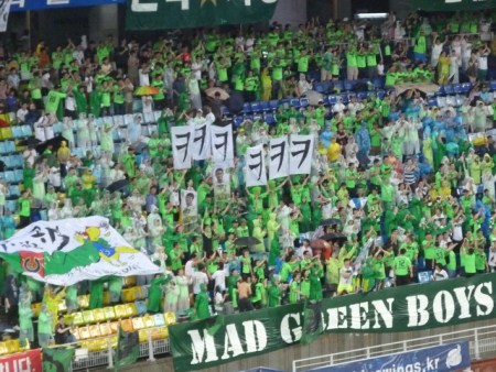 Jen and I got to the stadium early to make sure of a seat under cover in the East Stand and slowly worked our way through a box of fried chicken and a couple of bottles of red wine. Lee Dong Gook was starting up front for Jeonbuk and both Brazilians were in from the start. There had been reports before the game that Luiz had agreed to join UAE club Al-Shabab and so it was good to see him keep his place.