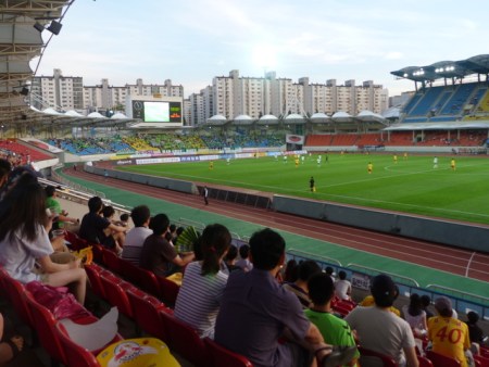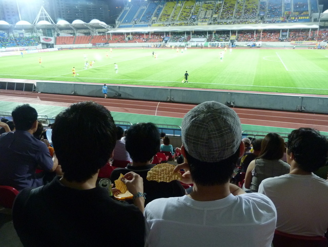 We’d decided to sit in the East Stand mainly because it meant we didn’t have to walk as far to get into it as we would have if we’d chosen the larger West Stand opposite. It was busy by Seongnam standards with a few hundred people in it and we had to walk most of the length of it to find the quietest section.