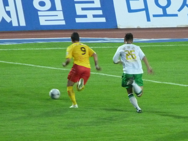 As the teams lined up for the National Anthem I noticed that Lee Dong Gook wasn’t starting despite having scored the winner against Gangwon three days earlier. He was on the bench though, his place having been taken by Jeong Seong Hoon. I’m not much of a fan of Mr. Jeong, to me he just seems like a fairly static target man with not much of a first touch. Still, with the K-League teams currently playing twice a week, I suppose you’ve got to make changes now and again.