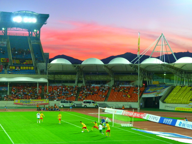 After an hour Jeonbuk made the change that I’d been waiting for and replaced Jeong Big Spud with Lee Dong Gook. The ex-Middlesbrough man contributed more to the general play, but opponents Seongnam still looked the better side. In the absence of any goals to report I’ll pad this out with a photo of the sun going down.