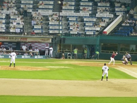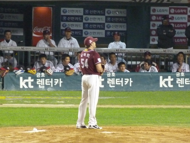 Brandon Knight was the starting pitcher for the visitors. He’s into his second season with Nexen after previously turning out for Samsung Lions. He’s had some decent moments in his career, including starting for the New York Mets at Shea Stadium and picking up a bronze medal for the USA at the Beijing Olympics.