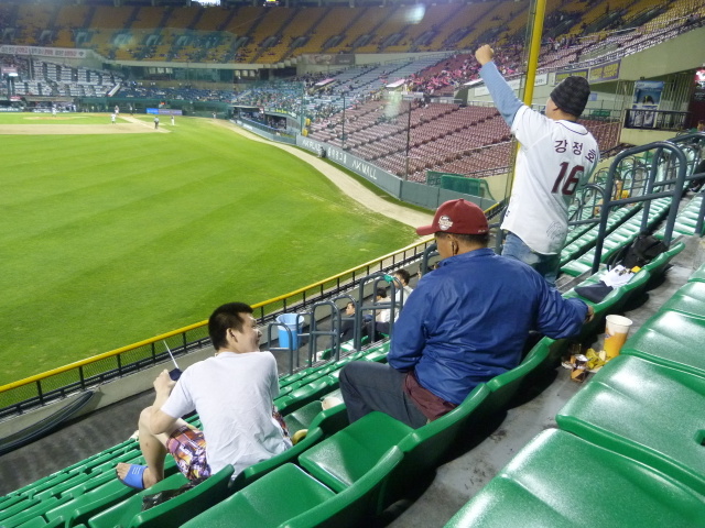 Jen and I were late setting off and it was already seven o’clock when we got there with Nexen leading by two runs to one. We didn’t have any trouble finding somewhere to sit with the thirty thousand capacity stadium being no more than a tenth full. Nobody likes a loser in Korea.