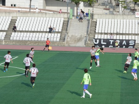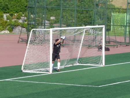 Both teams kept it tight in the opening half hour and neither keeper got his knees dirty.  Although I suppose on a plastic pitch that would have been unlikely no matter how much diving around they might have done. The closest we came to a goal was when a Goyang free-kick bounced harmlessly through to the Paju keeper who whilst attempting to catch it just under the crossbar caught one of his feet in the netting behind him and nearly conceded the sort of goal that would have made every ’cock-up’ video going.