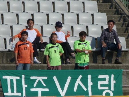 Paju were in luminous green shirts, whilst Goyang were wearing what looked like American referee shirts with thin black and white stripes. Goyang are bottom of their section of the league and with the visitors pushing for a play-off spot an away win seemed the most likely outcome.