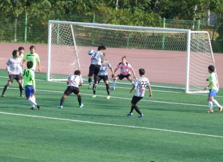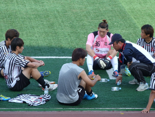 At half-time the Paju players went to the dressing room but the Goyang coach sat his players down by the touch-line and held his team-talk on the pitch. He didn‘t seem angry with them, I think it was more a case of him just enjoying the good weather. He used three water bottles to demonstrate positioning and movement, the gist of it seeming to be that one player should run in-between two of the opposition, drawing them both with him.