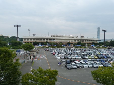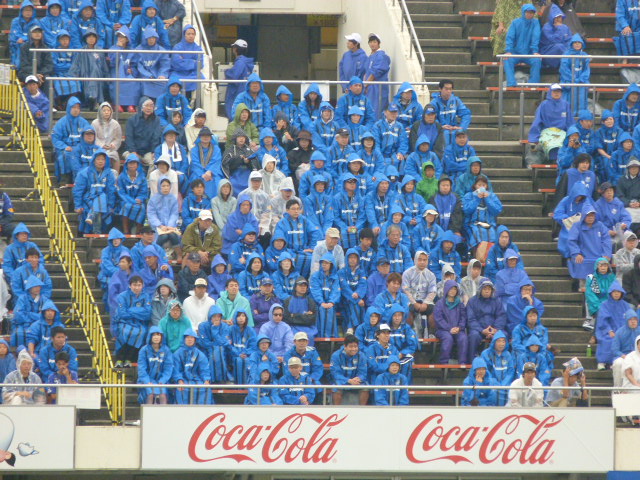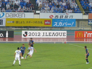 We would probably have spent a little longer at the bar but it was starting to rain and as neither of us had brought a coat we thought it better to get some tickets and make our way inside. The tickets started at 2,500 yen and went up to 5,500. We got two top-priced ones in the main stand (described as box seats) on the basis that they might have a better chance of being under cover. No chance. The small canopy covered only a small selection of local bigwigs and sponsors, everyone else in that stand and the rest of the ground found themselves exposed to the elements.