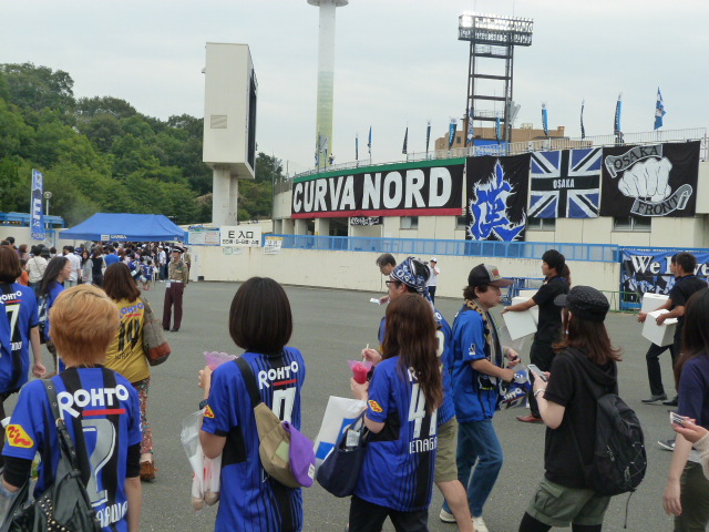 After lunch we took the train to Shin Osaka station, dumped our bags in the left luggage and then took an hour-long journey by subway and monorail to Gamba Osaka’s Expo ’70 Commemorative Stadium. I’d tell you the names of the subway stops but I’ve forgotten them. The lady in the Tourist Information at Shin Osaka knows though, so you can ask her.