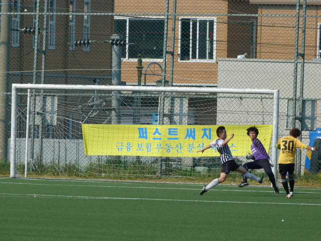 The opening exchanges were fairly even with both sides showing plenty of intent to get the ball into the opposition box. Namyangju, in black and white stripes, hit the bar after ten minutes whilst Jungnang, in yellow shirts and black shorts, replied in kind a little later.
