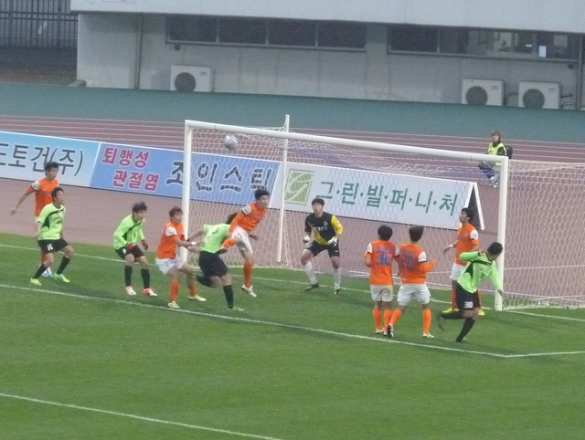 A few minutes after I’d arrived the ref blew for half-time rather than full-time and I was able to sit back, crack open the first can of the day and await the second half. Paju have had a decent first season in the Challengers League but are just starting to slip a bit. I saw them drop two points away at bottom of their section Goyang a few weeks ago and if they really wanted to remain in contention for a play-off spot then they needed to beat a Cheonan team that had nothing to play for.
