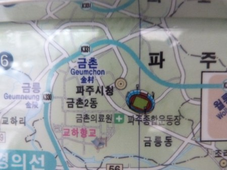 After watching the match between Jungnang Mustang Chorus and Namyangju United earlier in the afternoon I crossed Seoul on the subway, arriving at Geumchon station just before five o’clock. The game wasn’t scheduled to kick off until seven and so I thought I might as well just walk to the stadium. It’s easy enough, you come out of exit one, cross the road and continue in the same direction along the main road for about twenty minutes.