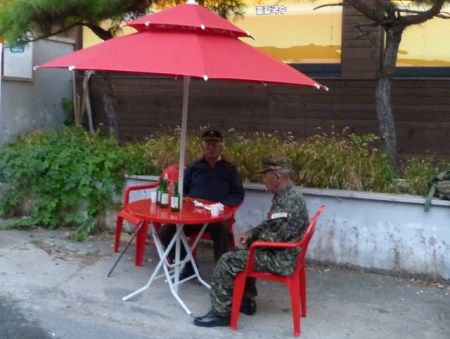 Paju is only a few miles from the border with North Korea and so I’d expected to see quite a sizeable military contingent. I was wrong in my assumption though and the only uniformed presence I spotted were these two old fellas drinking soju outside of a convenience store. If the North are ever going to make their move, I’d suggest targeting Paju on a Saturday tea-time.