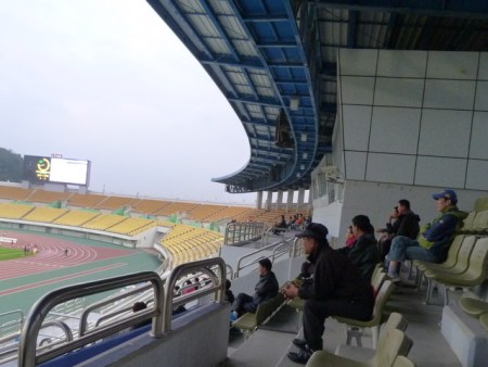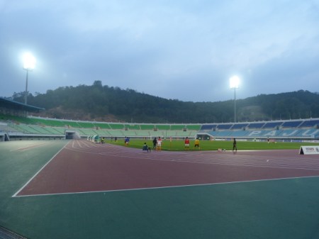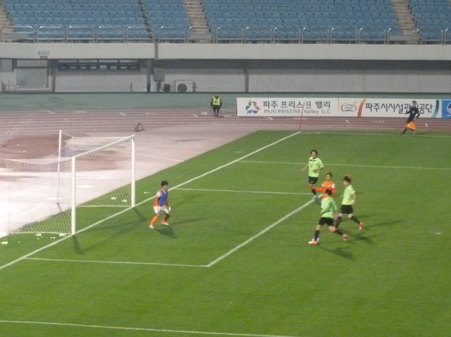 The stadium is a fairly typical example of a Korean multi-purpose ground. A mainly open bowl with limited covering down one side and a running track separating the spectators from the pitch. An interesting feature of this ground though was the view of some graves up on the hillside behind the goal to my left. It also has a caldron for a flame, which would come in very handy should Jacques Rogge ever decide that Paju would be an ideal choice for staging the Olympics.