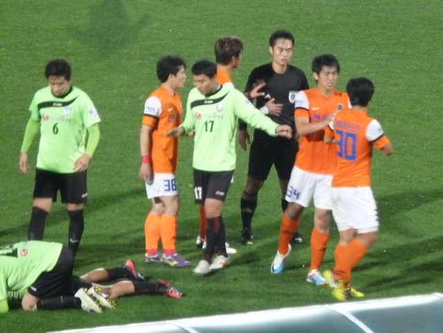 Cheonan were still squabbling amongst themselves a couple or minutes later and Paju quickly grabbed a third goal. The sudden capitulation seemed too much for the visitors and their left back was sent off soon after. He stomped off, throwing his shirt down Keegan-style.