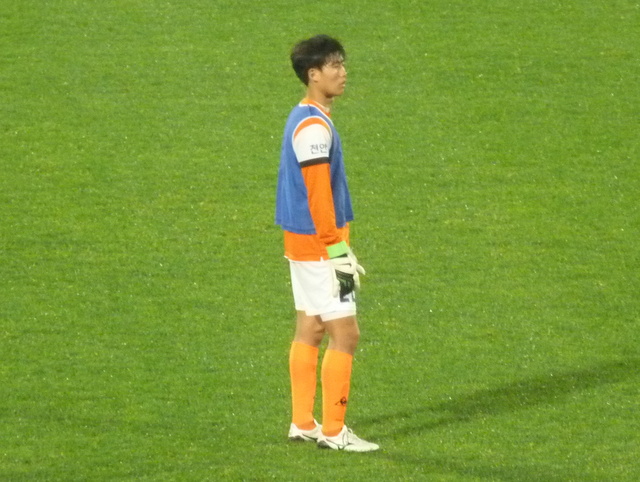 With seven minutes to go Paju striker Yang Hyo Jik somehow managed to nip between a Cheonan defender and the keeper to stroke the ball home and make it 4-1. The beaten keeper Woo Tae Shik must have said something to the ref and he got a straight red for his trouble. Cheonan didn’t have a substitute keeper and so outfield player Kwon Tae Joon had to go in goal. Unfortunately Woo Tae Shik had buggered off with his goalie top and in the absence of a spare, Kwon had to make do with a training bib.