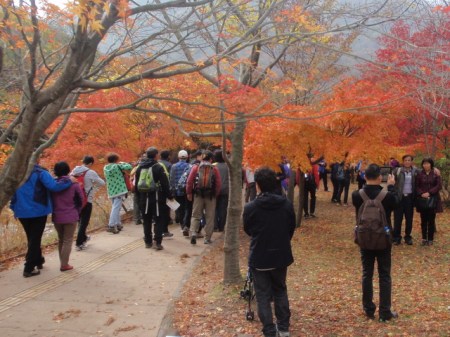 It’s a journey that should take around fifteen minutes, but the lure of the leaves caused so much congestion that after half an hour the driver dropped us at a car park a couple of miles from the National Park. There were dozens of coaches, hundreds of cars and thousands of people. It seemed that most of latter were queueing for the shuttle bus that would take them the remaining two miles, despite them being togged up in their best hiking gear.