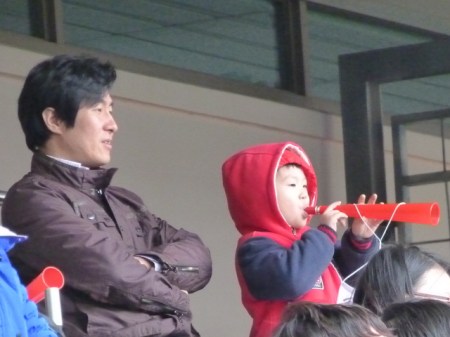 I was right, every seat in that section was empty. They were empty because the upper tier access had been taped off. The home officials must have decided that with the lower tier being sufficient for Suwon’s two thousand strong travelling support there was no point opening the area above. It was certainly a decision that the cleaners would have welcomed as Suwon fans like to make a bit of a mess. As the teams came out thousands of pieces of coloured card were thrown in the air. Some kids made a point of hanging on to them to take home to draw on, but most were more than happy to launch them skywards.