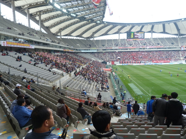 Jen and I took the subway to the World Cup Stadium station on line six and picked up a couple of 14,000 won tickets for the Suwon end. Whilst I like the atmosphere of a fullish ground, I also like a bit of space and thought that there would be plenty of room in the upper tier of the away section.