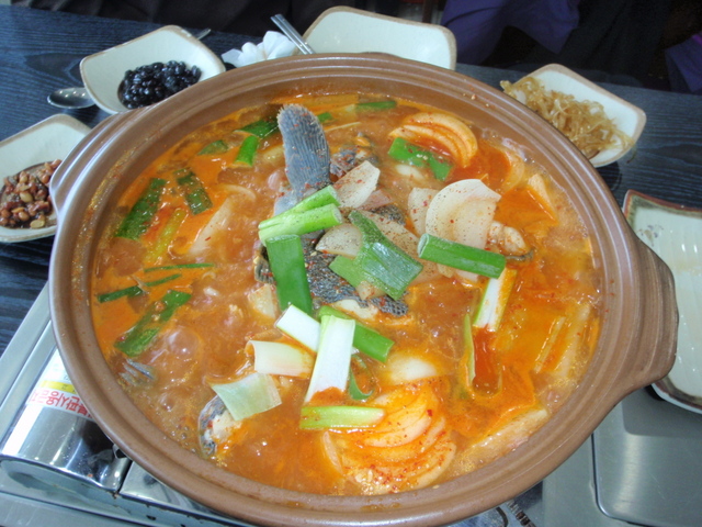Halfway around we stopped for a fish stew lunch. I’m not sure what type of fish it was but we watched it being netted from the tank outside. A few slices turned up fried as part of the side dishes with the remainder being cooked at our table on one of those little gas canister stoves.