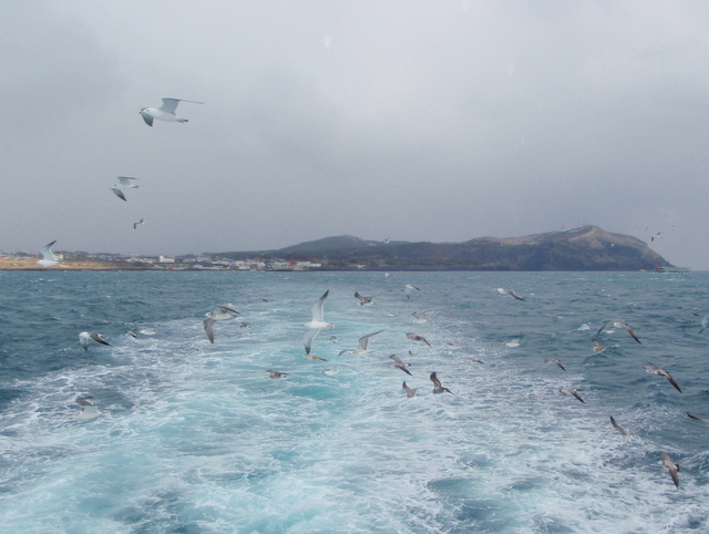 We made the boat. Just. It would have been another hour if we’d had to wait for the next one and once you’ve circled the island I think you’ve just about seen it all. I spent most of the crossing back to Seongsan throwing pieces of doughnut to the seagulls. I’m sure Cantona had a theory about that sort of thing.