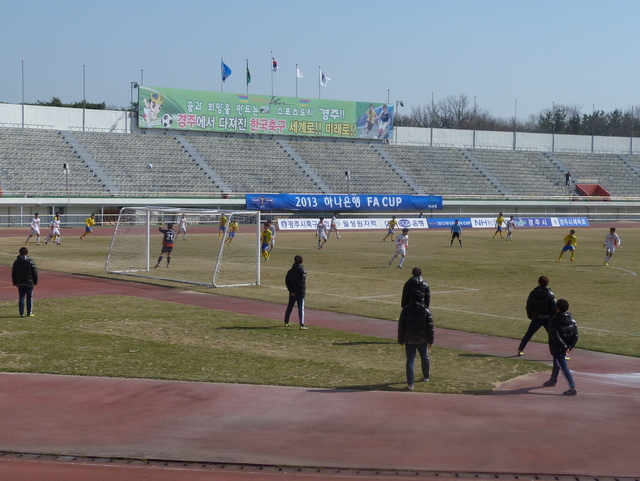 It’s half an hours walk from the bus station to Gyeongju’s ground. The football stadium is part of a bigger complex with taekwondo and wrestling venues, plus half a dozen artificial pitches, all of which could easily have staged this game.