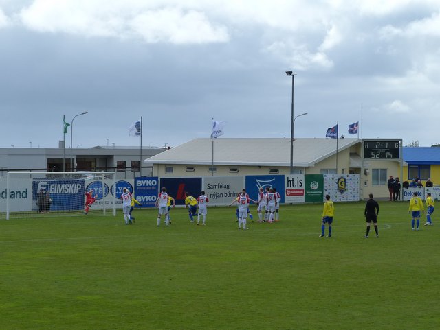 Grindavik town was easy enough to find and the football ground easier still. I left Jen in a cafe, paid my 1500 kronar and took a seat amongst the hundred and fifty or so other fans in the main stand. Well, the only stand. Grindavik were in yellow and blue whilst visitors BI were in white with red sleeves.