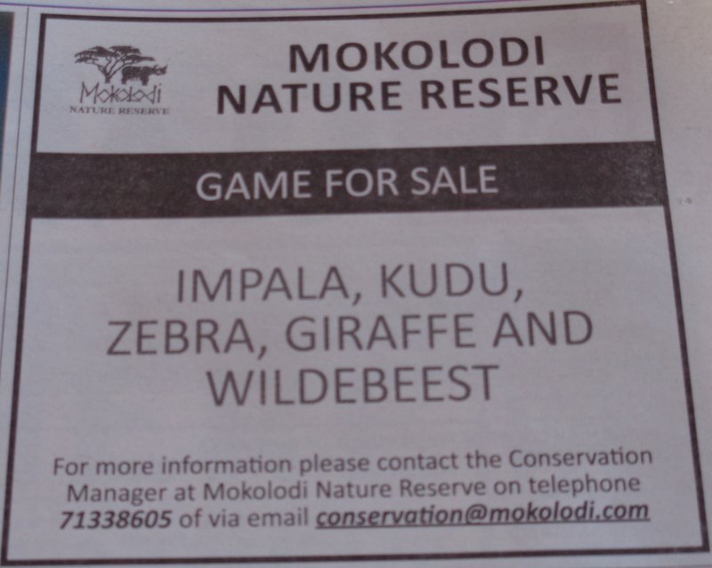 I noticed an advert in the paper the next day for some of the livestock on the reserve. It certainly beats your standard gift shop, although we’d have struggled to have got any of them on the plane back to Johannesburg.