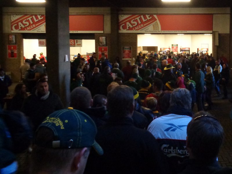 As we sat with our drinks in the concourse, a couple of blokes in their seventies staggered past. One was in a New Zealand shirt, the other in the green of South Africa. They were so ratarsed that they relied upon each other to stay upright. I d like to think that I’ll still getting in that state when I’m their age.