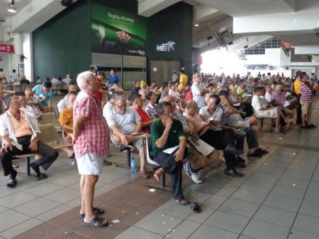 It was six ringgits to get in and then another twenty for admission to a lounge on the top floor of the grandstand. I’d hoped that our three quid upgrade would get us air-conditioning, but we had to settle for electric fans that did not much more than help to re-distribute the cigarette smoke.