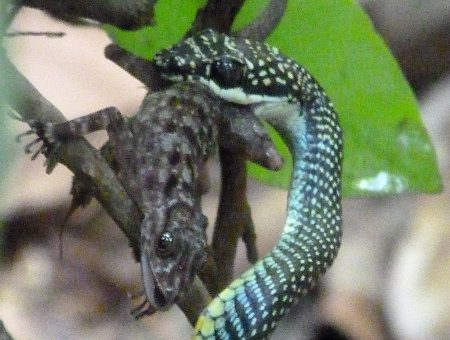 I’ve no idea if the snake was venomous or not, even after a subsequent google search, but there was no way he was going to drop his dinner to give me a cautionary nip. On the other hand, his Dad might have been keeping an eye out for him and so I moved them from the path into the undergrowth and we watched him finish his lunch.