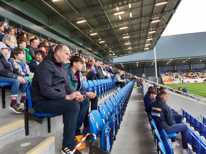 The reason our tickets hadn’t worked was that we’d tried to use them at the wrong entrance. Our seats were just right of centre in the main stand and so we should have gone in at the next entrance further along. We reached our seats by stepping over taped barriers that looked as if they were intended to block off the central area for subs and team officials. Nobody seemed bothered though, it was all very relaxed.